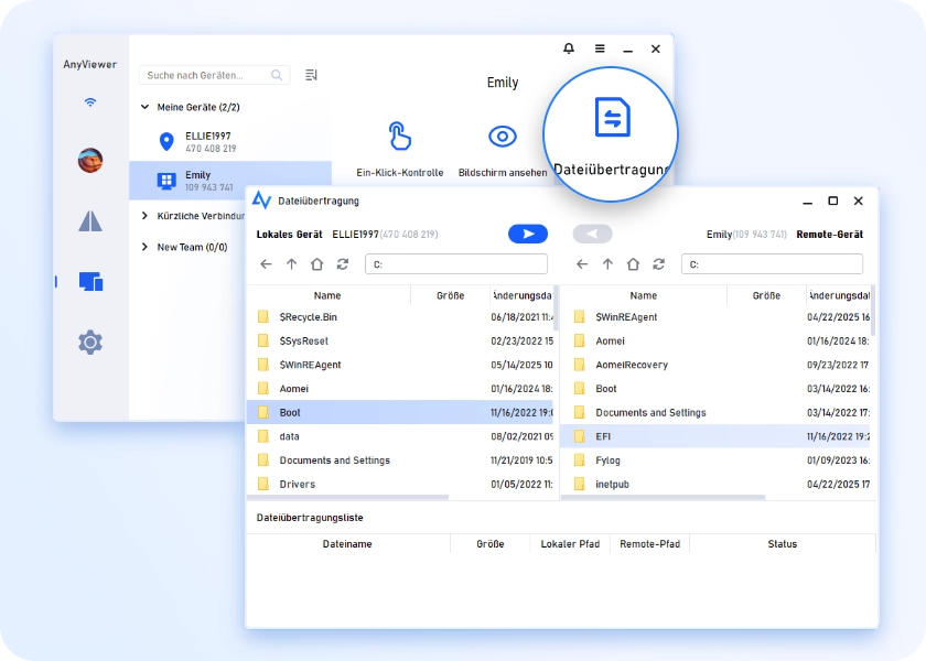 Die beste Methode für die Übertragung großer Dateien ist die Verwendung einer speziellen Übertragungssoftware. Anders als bei E-Mail und den meisten Messaging-Plattformen gibt es bei diesen Tools keine strengen Größenbeschränkungen. Mit AnyViewer zum Beispiel können Sie große Dateien schnell und sicher übertragen - ein zusätzlicher FTP-Client ist nicht erforderlich. Seine Schnelligkeit und Zuverlässigkeit machen ihn zur ersten Wahl für mühelose Übertragungen.