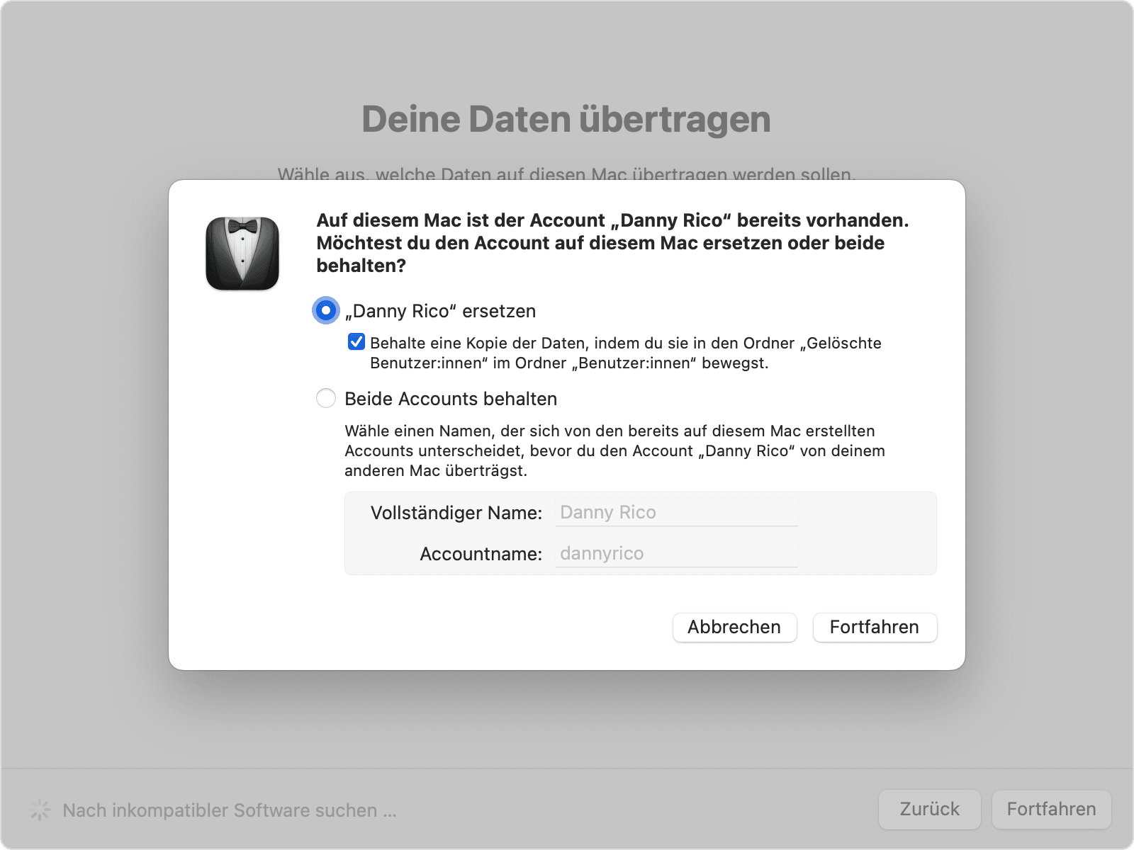 Wenn auf dem neuen Mac bereits ein Konto mit demselben Namen vorhanden ist, können Sie Folgendes tun: