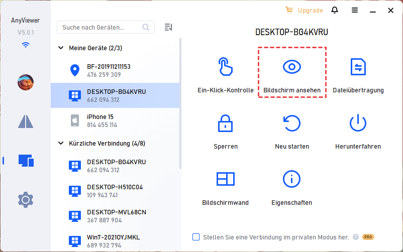 Schritt 3. Wählen Sie auf Ihrem lokalen Gerät den Remote-Computer aus, von dem der Bildschirm gespiegelt werden soll, und wählen Sie „Bildschirm ansehen“, um dessen Bildschirm auf Ihrem lokalen Windows-Computer zu spiegeln.