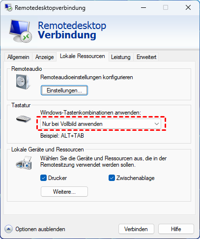 Um sicherzustellen, dass Windows-Tastenkombinationen während einer Remote-Desktop-Sitzung ordnungsgemäß funktionieren, richten Sie die Remote-Desktop-Verbindung folgendermaßen ein: