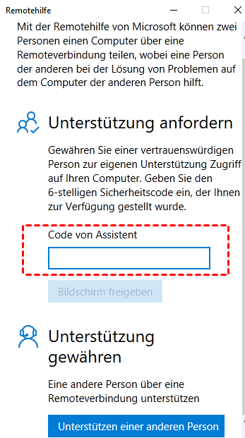 Schritt 5: Geben Sie auf dem Remote-Computer den Sicherheitscode unter Code vom Assistenten ein und klicken Sie auf Bildschirm freigeben.