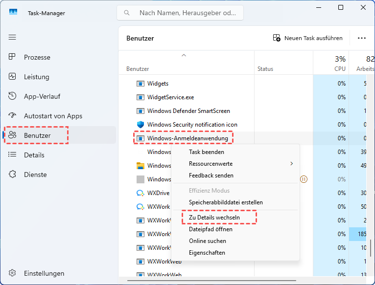 Schritt 2: Wechseln Sie zur Registerkarte „Benutzer“ und erweitern Sie den Benutzer mit dem Status „Getrennt“. Klicken Sie mit der rechten Maustaste auf den Windows-Anmeldeprozess eines dieser Benutzer und wählen Sie „Zu Details wechseln“.
