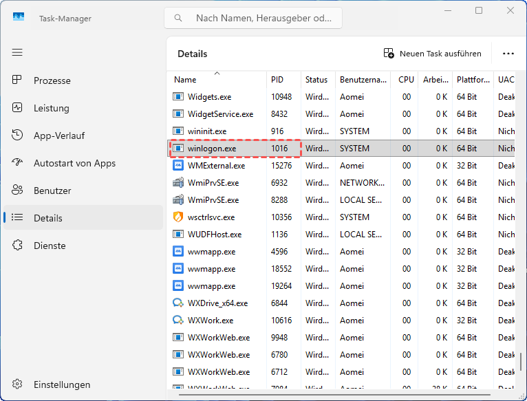 Schritt 3: Suchen Sie den Prozess „winlogon.exe“ und notieren Sie sich seine Prozess-ID (PID).
