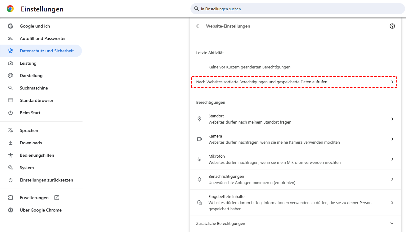 Schritt 2: Gehen Sie anschließend zu „Datenschutz und Sicherheit“ > „Website-Einstellungen“ > „Nach Websites sortierte Berechtigungen und gespeicherte Daten aufrufen“.