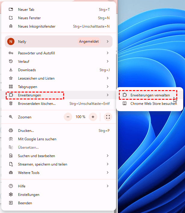Schritt 1: Öffnen Sie Google Chrome und melden Sie sich in Ihrem Konto an. Klicken Sie auf das Menüsymbol > Erweiterungen > Erweiterungen verwalten.