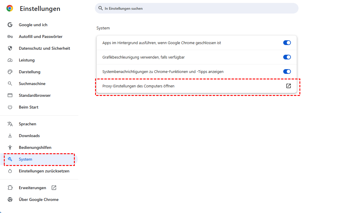 Schritt 2: Navigieren Sie zu „System“. Klicken Sie auf „Proxy-Einstellungen des Computers öffnen“.