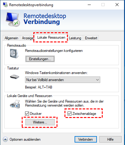 Schritt 2. Gehen Sie auf der Hauptschnittstelle von Remotedesktopverbindung auf die Registerkarte Lokale Ressourcen und markieren Sie dann Zwischenablage.