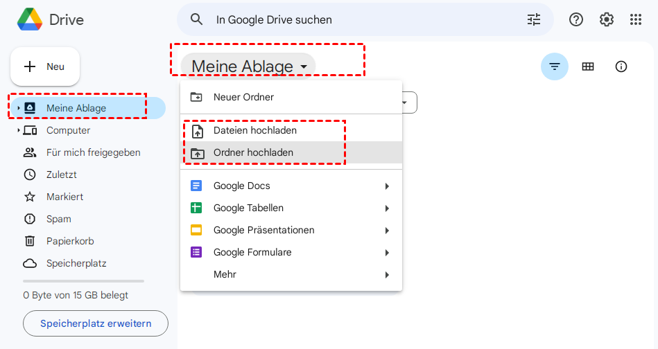 Schritt 1. Öffnen Sie die Hauptoberfläche von Google Drive, suchen und klicken Sie auf Mein Laufwerk in der linken Seitenleiste, klicken Sie erneut auf Mein Laufwerk und wählen Sie Dateien hochladen oder Ordner hochladen im erweiterten Menü aus.