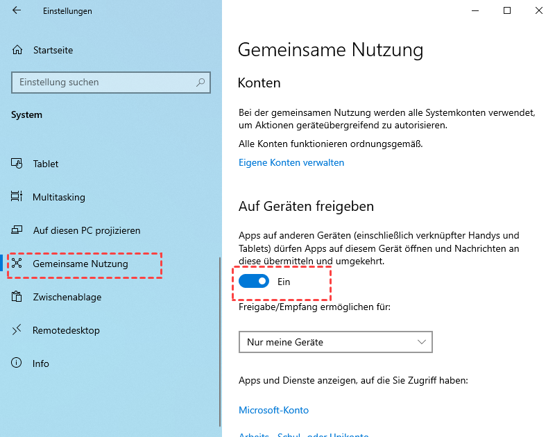 - „Meine Geräte“ bedeutet, dass Ihr PC Inhalte nur mit Geräten teilen oder empfangen wird, die dasselbe Microsoft-Konto verwenden.