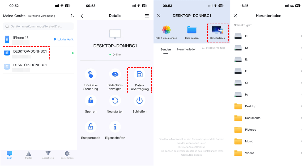 Um Dateien von Windows auf das iPhone zu übertragen, tippen Sie auf „Herunterladen“. Wählen Sie einfach die gewünschten Dateien aus und übertragen Sie sie sofort.