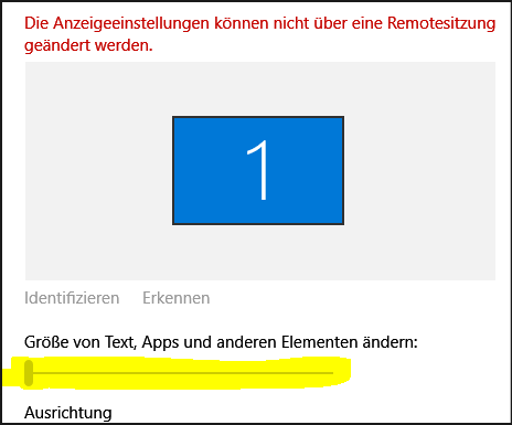 Hallo Leute. Ich habe einen virtuellen Server auf Basis von Windows Server 2016 Standard, der als Remotedesktopdienste-Server dient. Benutzer, die sich über den RDC-Client damit verbinden, müssen die Skalierung der Größe von Text, Apps und anderen Elementen von den empfohlenen 100 % auf 125 % ändern. Es heißt jedoch: „Die Anzeigeeinstellungen können nicht über eine Remotesitzung geändert werden.“ Gibt es eine Umgehung für dieses Problem?