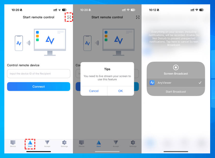 Schritt 4. Installieren Sie AnyViewer auf Ihrem iPhone, melden Sie sich mit demselben Konto an und tippen Sie auf „Starten“. Scannen Sie mit Ihrem iPhone den auf Ihrem Mac angezeigten QR-Code und tippen Sie dann auf „Übertragung starten“.