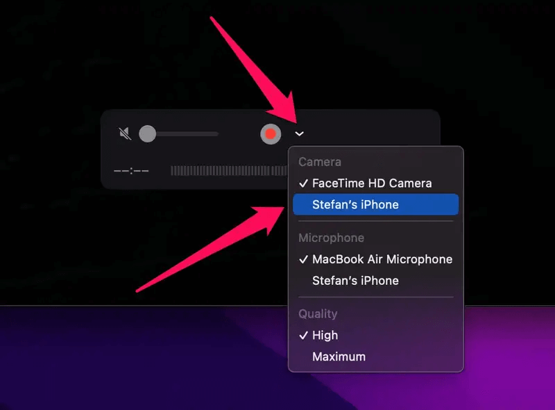Schritt 4. Klicken Sie auf den Pfeil neben der Aufnahmetaste und wählen Sie Ihr iPhone aus.