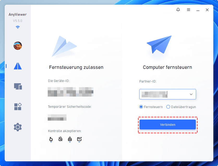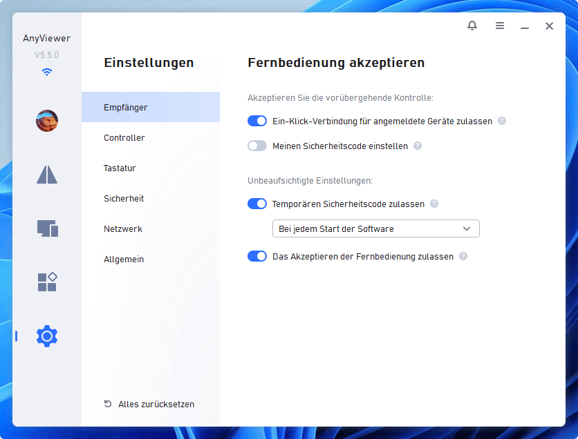AnyViewer unterstützt sowohl unbetreuten als auch betreuten Remote-Zugriff. Beide Varianten lassen sich jederzeit aktivieren oder deaktivieren.
