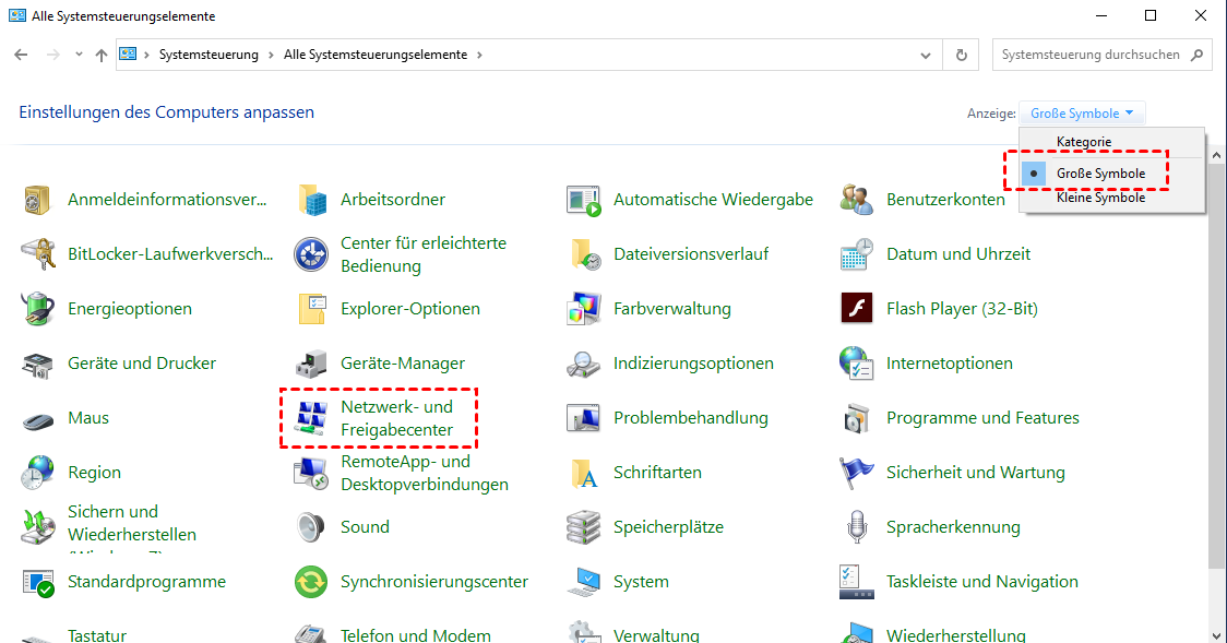 Schritt 2. Ändern Sie oben rechts auf der Hauptoberfläche der Systemsteuerung den Ansichtsmodus in Große Symbole und suchen Sie Netzwerk- und Freigabecenter.