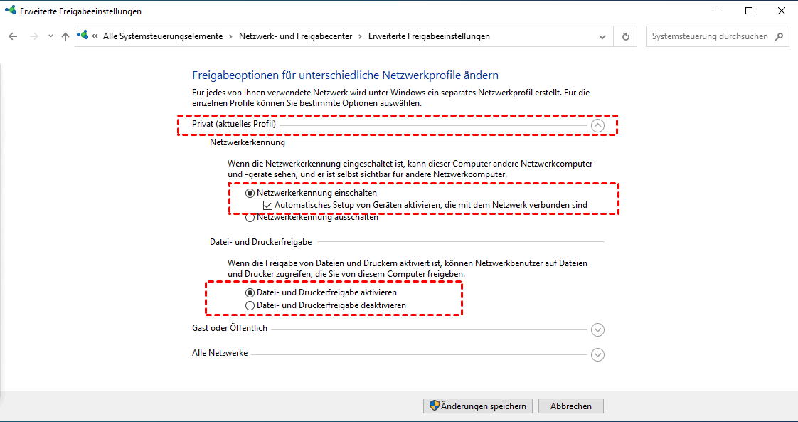 Schritt 3. Klicken Sie im linken Bereich auf Erweiterte Freigabeeinstellungen. Aktivieren Sie die Netzwerkerkennung sowie Datei- und Druckerfreigabe. Klicken Sie dann auf Änderungen speichern.