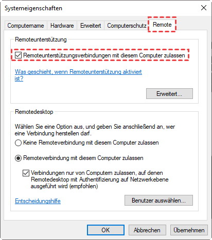 Schritt 2. Gehen Sie im Pop-up-Fenster zu „Remote“ und aktivieren Sie „Remoteunterstützungsverbindungen mit diesem Computer zulassen“.
