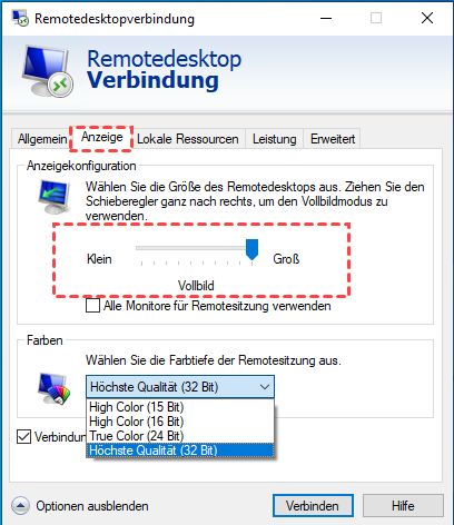 Sie können den Vollbildmodus für Verbindungen manuell einstellen.