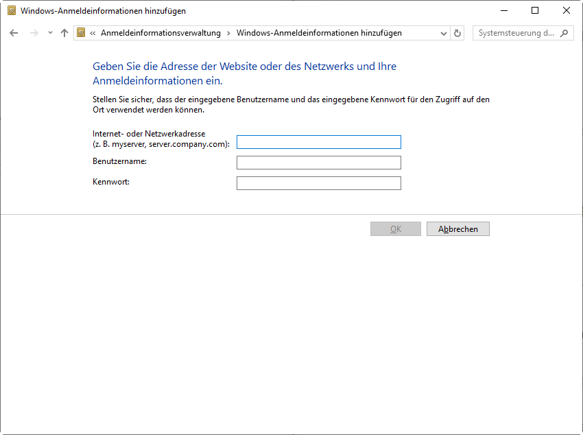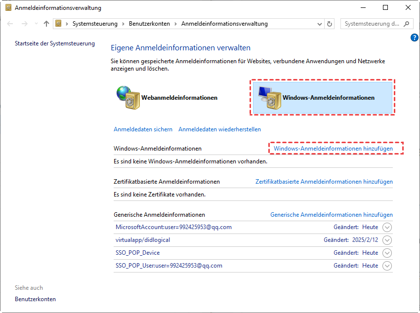 Schritt 2. Wählen Sie Windows-Anmeldeinformationen und klicken Sie auf Windows-Anmeldeinformationen hinzufügen.