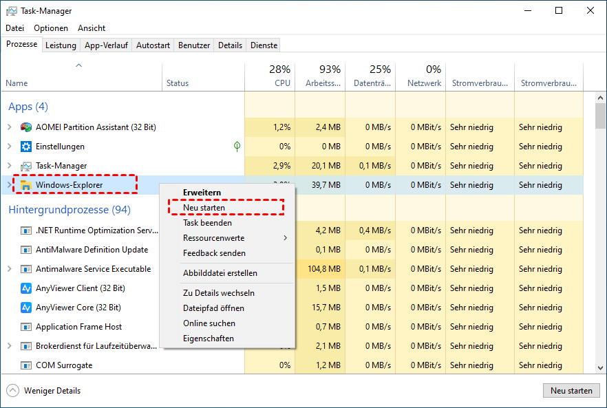 Schritt 2. Suchen Sie den Windows Explorer, klicken Sie mit der rechten Maustaste darauf und klicken Sie im erweiterten Menü auf Neu starten.