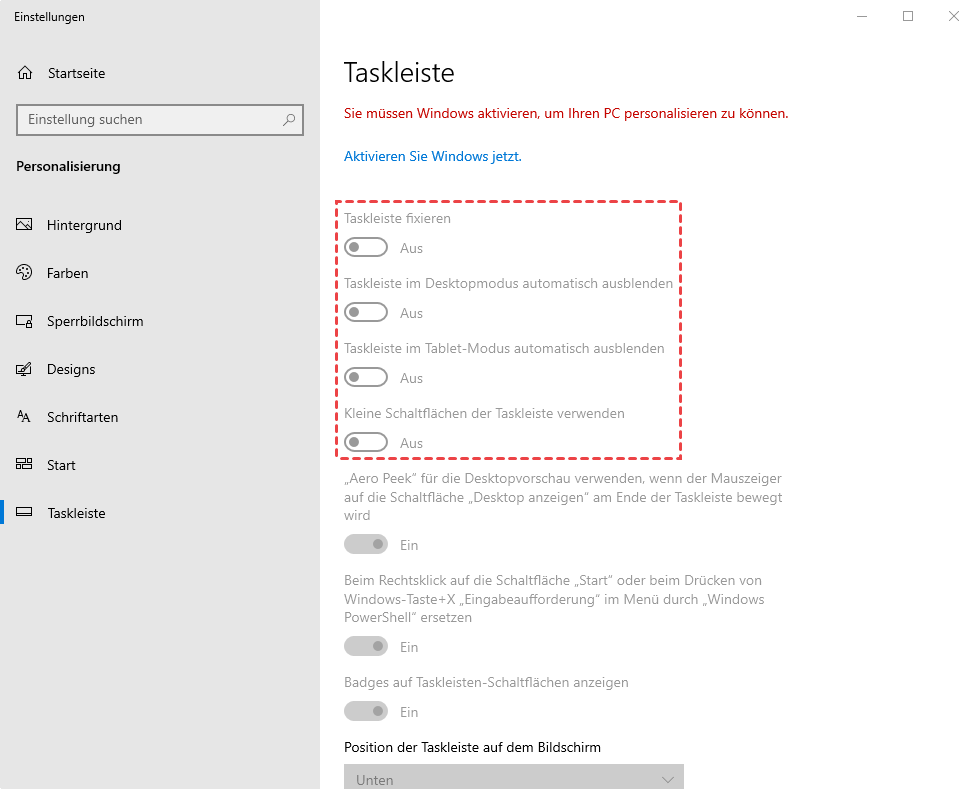 Schritt 2. Gehen Sie zum Abschnitt Taskleiste und deaktivieren Sie die folgenden Optionen.