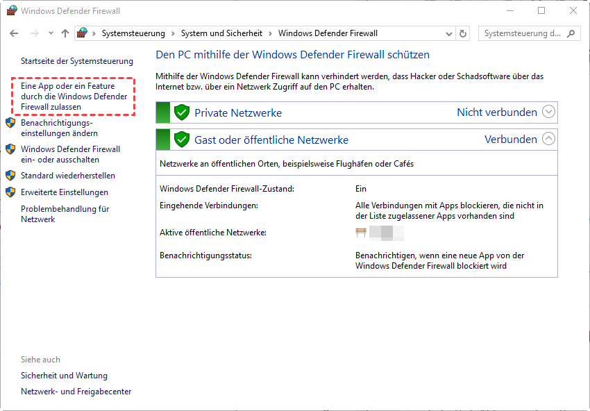 Schritt 1. Öffnen Sie die Windows Defender Firewall und wählen Sie „Eine App oder ein Feature durch die Windows Defender Firewall zulassen“.