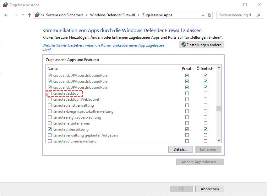 Stellen Sie sicher, dass die Firewall für den RDP-Port zugänglich ist.