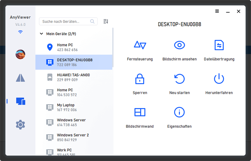 Daher ist es ratsam, sich an eine professionelle PC-Fernsteuerungssoftware, AnyViewer, zu wenden. Mit ihr können Sie die Fernverwaltung von Computern mit Ihrem lokalen Gerät von jedem Ort aus und zu jeder Zeit problemlos durchführen. Darüber hinaus kann es die volle Kontrolle über entfernte Computer übernehmen und Dateien übertragen, was die Arbeit aus der Ferne bequemer und effektiver macht. Schauen wir uns nun an, wie es mit dem Herunterfahren von Remote-PCs funktioniert.