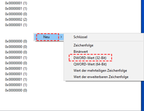 Schritt 3. Suchen Sie Registrierungs-Editor „LocalAccountTokenFilterPolicy“; wenn er nicht vorhanden ist, können Sie dies wie folgt tun. Klicken Sie im rechten Bereich mit der rechten Maustaste und wählen Sie dann „DWORD-Wert (32-Bit)“.