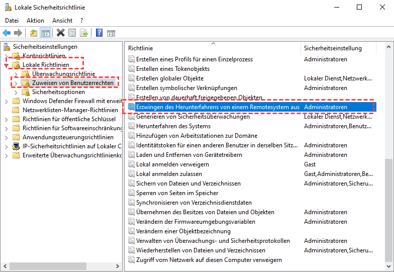 Schritt 2. Navigieren Sie zu: Lokale Richtlinien > Zuweisen von Benutzerrechten > Erzwingen des Herunterfahrens von einem Remotesystem aus Administoren.