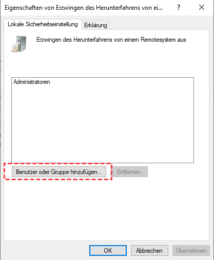 Schritt 3. Doppelklicken Sie auf „Erzwingen des Herunterfahrens von einem Remotesystem aus Administoren“ und klicken Sie dann auf „Benutzer oder Gruppe hinzufügen“.