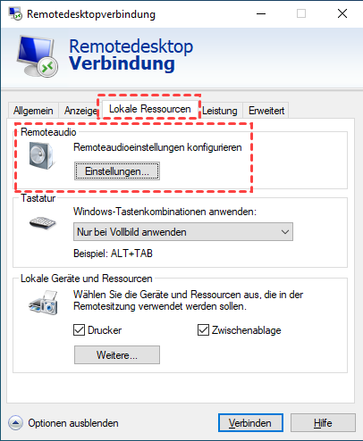 Schritt 2. Wählen Sie die Registerkarte „Lokale Ressourcen“, dann sehen Sie „Remoteaudio“ und klicken auf „Einstellungen“.