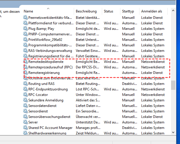 Schritt 2. Blättern Sie in der Liste der Dienste nach unten und suchen Sie dann alle Namen mit dem Begriff „Remote“. Vergewissern Sie sich, dass der „Starttyp“ für alle diese Namen auf „Manuell“ oder „Automatisch“ eingestellt ist. Dann kann Ihr Remotedesktop normal ausgeführt werden.