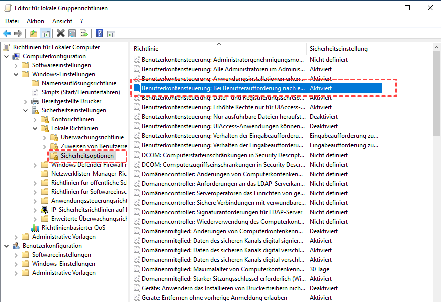 Schritt 2. Navigieren Sie zu: Computerkonfiguration > Windows-Einstellungen > Sicherheitseinstellungen > Lokale Richtlinien > Sicherheitsoptionen. Suchen Sie nach Benutzerkontensteuerung: Bei Benutzeraufforderung nach erhöhten Rechten zum sicheren Desktop wechseln.