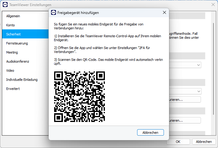 TeamViewer zeigt einen QR-Code an. Öffnen Sie die gewählte Authenticator-App auf Ihrem Smartphone und scannen Sie den QR-Code. Dadurch wird die Verknüpfung zwischen Ihrem TeamViewer-Konto und der App hergestellt.