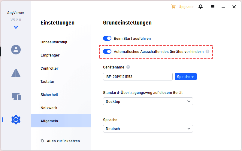 AnyViewer sperrt den Computer standardmäßig nicht nach Verbindungsende. Sie können den Computer auch so einstellen, dass er bei laufendem AnyViewer nie in den Ruhezustand wechselt. Gehen Sie dazu zu Einstellungen > Allgemein > Aktivieren Sie „Automatisches Ausschalten des Geräts verhindern“.