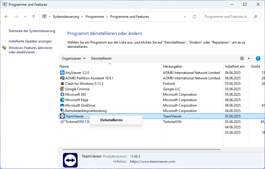 Schritt 2: Suchen Sie TeamViewer, klicken Sie mit der rechten Maustaste darauf und wählen Sie „Deinstallieren“.