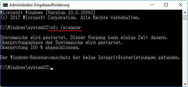 Schritt 2: Geben Sie in der Eingabeaufforderung mit erhöhten Rechten den folgenden Befehl ein und drücken Sie die Eingabetaste: „sfc /scannow“. Bitte haben Sie Geduld, da dieser Vorgang einige Zeit in Anspruch nehmen kann und Sie ihn unbedingt nicht unterbrechen sollten.