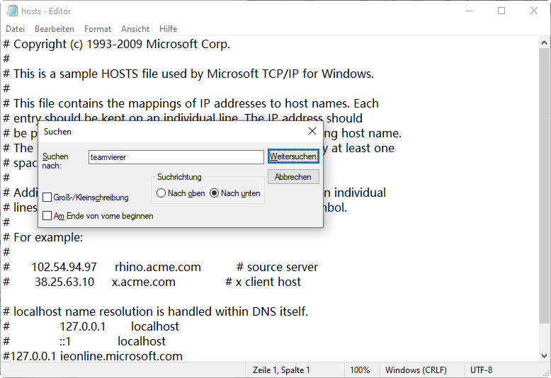 Ein beschädigter TeamViewer-Eintrag in der Hostdatei kann ebenfalls zu der Meldung „TeamViewer Internetverbindung nicht bereit“ führen. Löschen Sie in diesem Fall den Abschnitt „TeamViewer“ aus der Hostdatei.