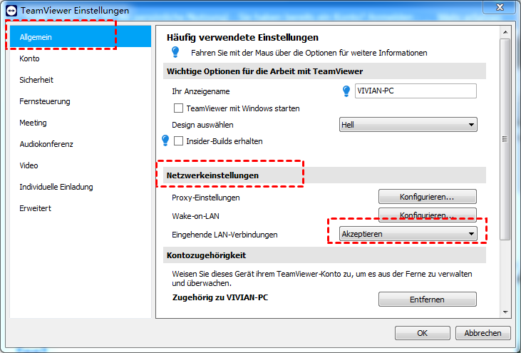 Überprüfen Sie zunächst, ob TeamViewer so eingestellt ist, dass nur LAN-Verbindungen zugelassen werden.
