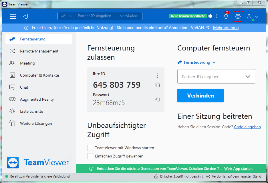 Schritt 1: Öffnen Sie auf dem Remotecomputer die Einstellungen (oben rechts).
