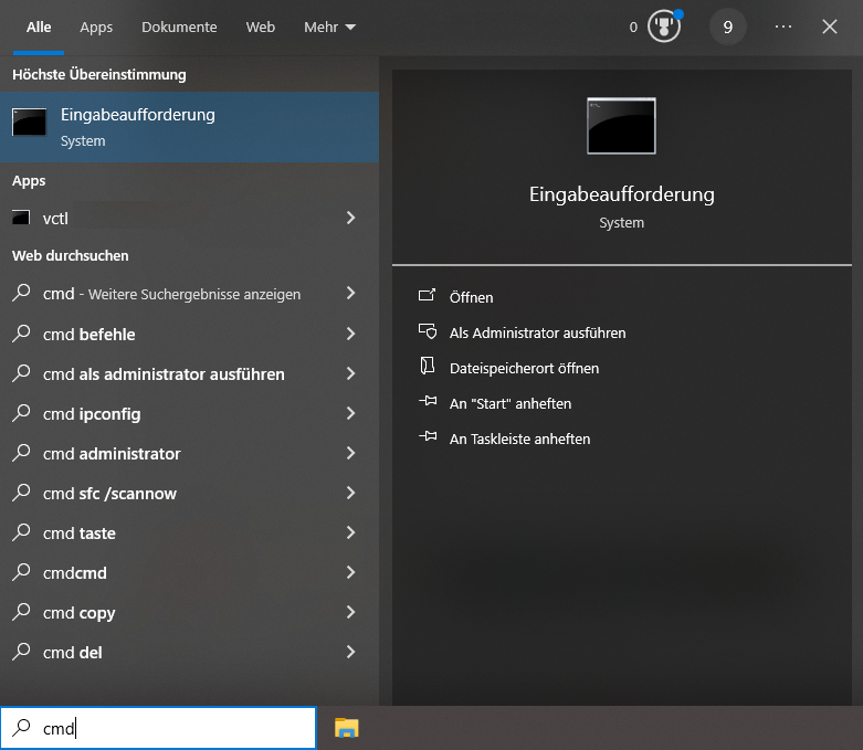 Schritt 1: Drücken Sie die Tastenkombination Win + S und geben Sie cmd ein. Wählen Sie „Als Administrator ausführen“.