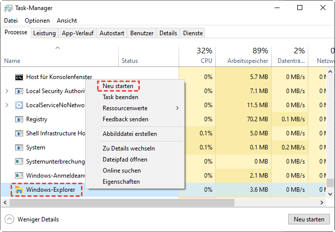 Schritt 2: Suchen und klicken Sie im Task-Manager auf den Windows Explorer.