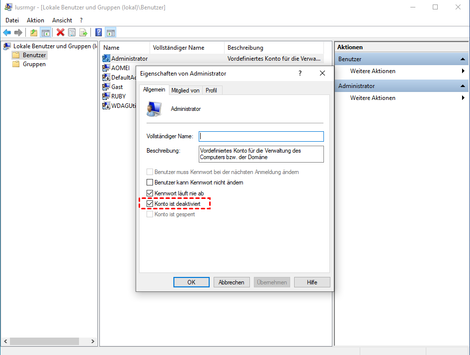 Schritt 3. Deaktivieren Sie die Option Konto ist deaktiviert und klicken Sie auf OK.