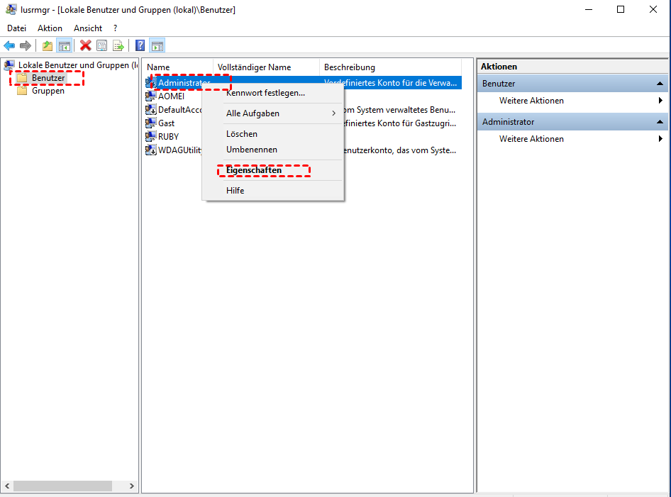 Schritt 2. Klicken Sie auf Benutzer. Finden Sie den Administrator und klicken Sie mit der rechten Maustaste darauf, wählen Sie dann Eigenschaften.
