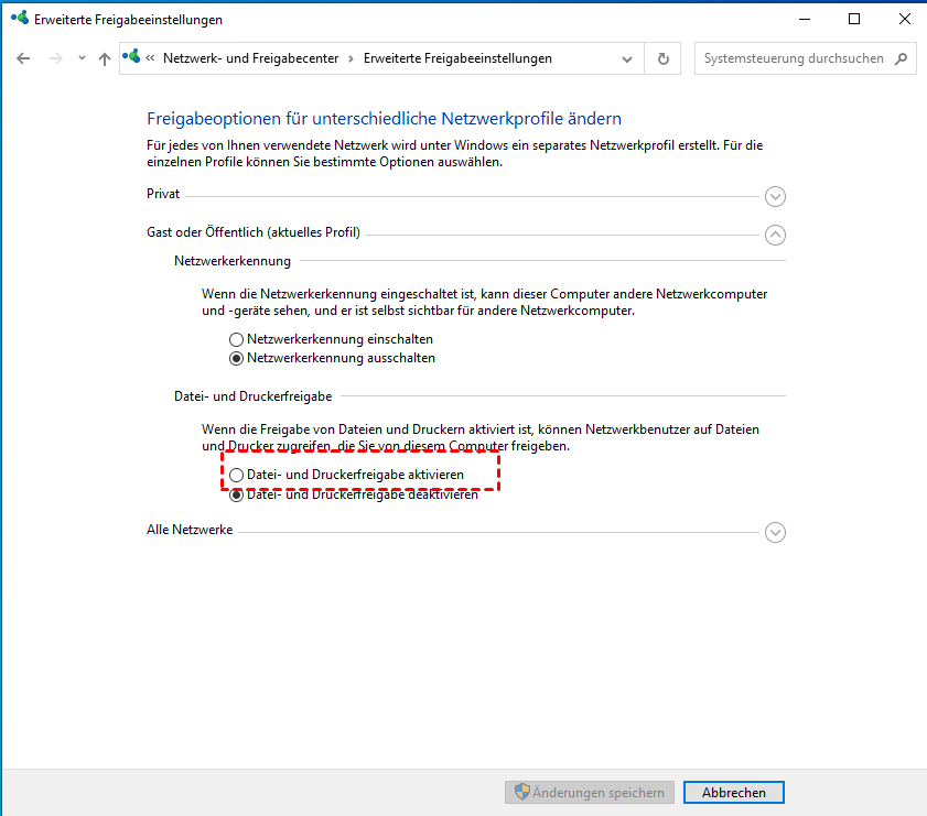 - Aktivieren Sie die Datei- und Druckerfreigabe