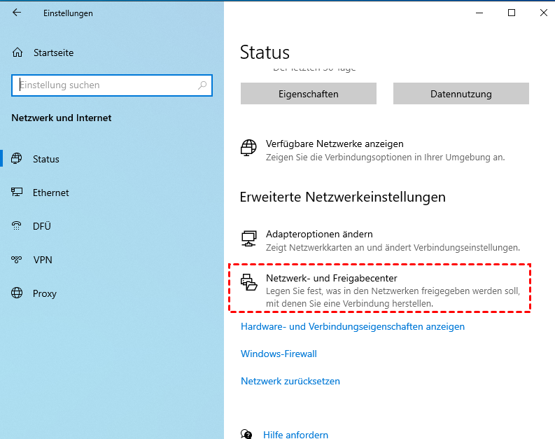 Schritt 1. Navigieren Sie hierhin: Start > Einstellungen > Netzwerk & Internet. Finden und klicken Sie auf Netzwerk- und Freigabecenter.