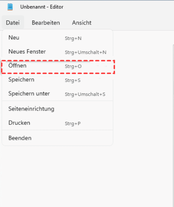 Schritt 1. Suchen Sie im Suchfeld nach Editor und klicken Sie auf Datei > öffnen.