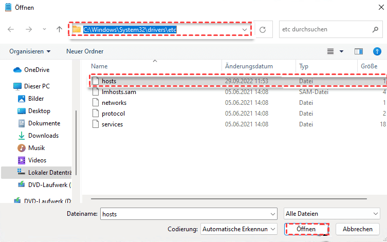 Schritt 2. Öffnen Sie dann die Datei in C: /Windows/ System32/ Drivers/etc und klicken Sie auf hosts und wählen Sie und klicken Sie auf „Öffnen“.