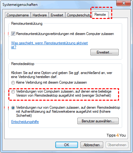 Schritt 3. Aktivieren Sie auf der Registerkarte Remote, die Option Verbindungen nur von Computern zulassen, auf denen eine beliebige Version von Remotedesktop ausgeführt wird. Klicken Sie dann auf Übernehmen und OK.
